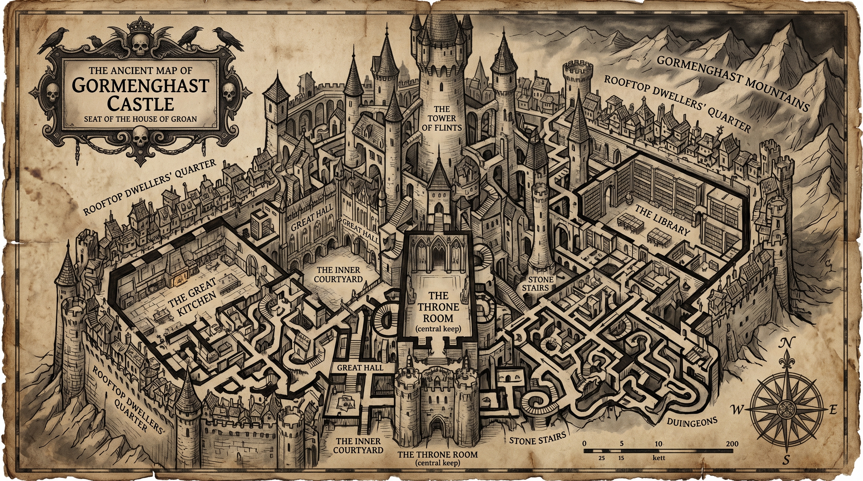 A dark, rook-haunted tower at the castle heart: lonely, ancient, and unnecessary.